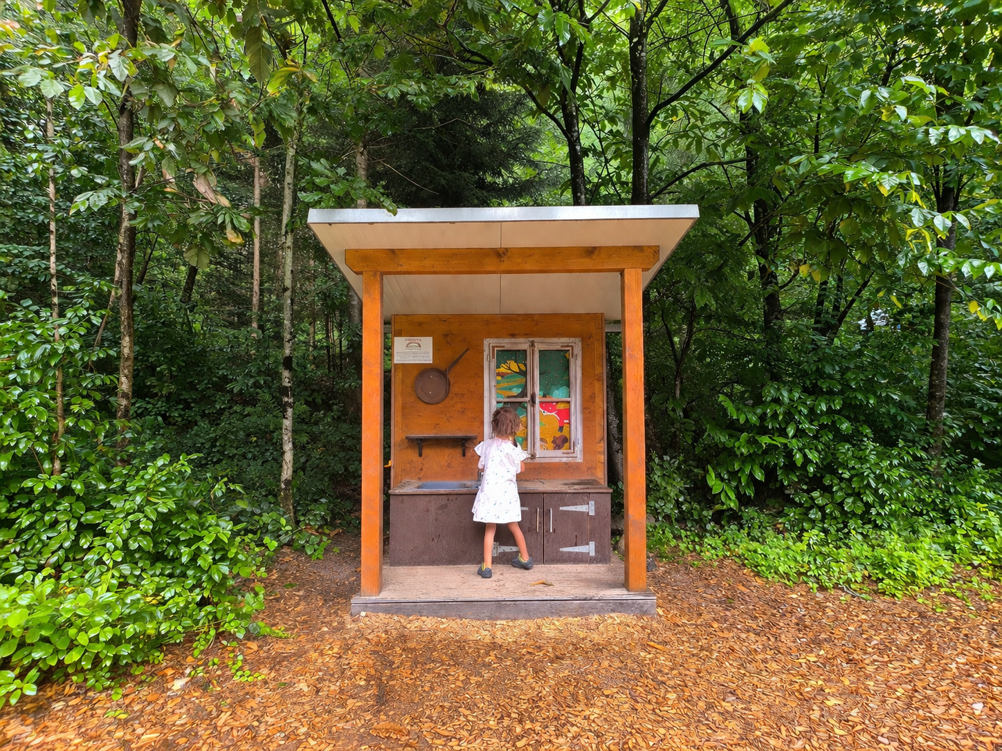 En medio del recorrido nos encontramos con un refugio en el bosque que nos sorprendió bastante: tenía una pequeña cocinita de madera para que jueguen los niños y hasta un grifo que funcionaba de verdad. Las niñas se lo pasaron pipa allí, fue de esos sitios que no te esperas y que hacen la ruta todavía más especial.