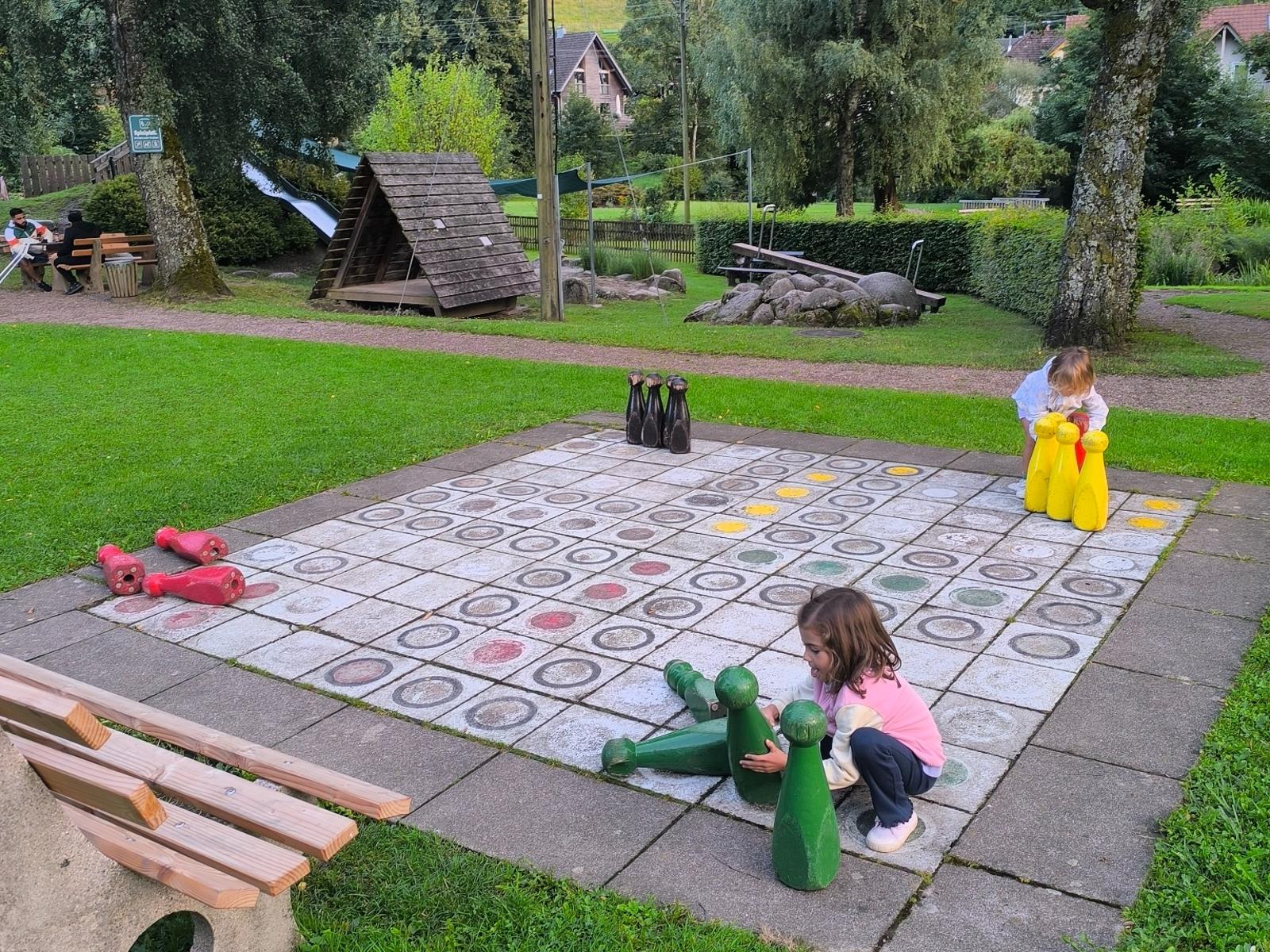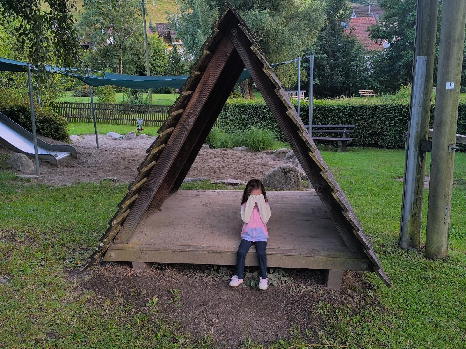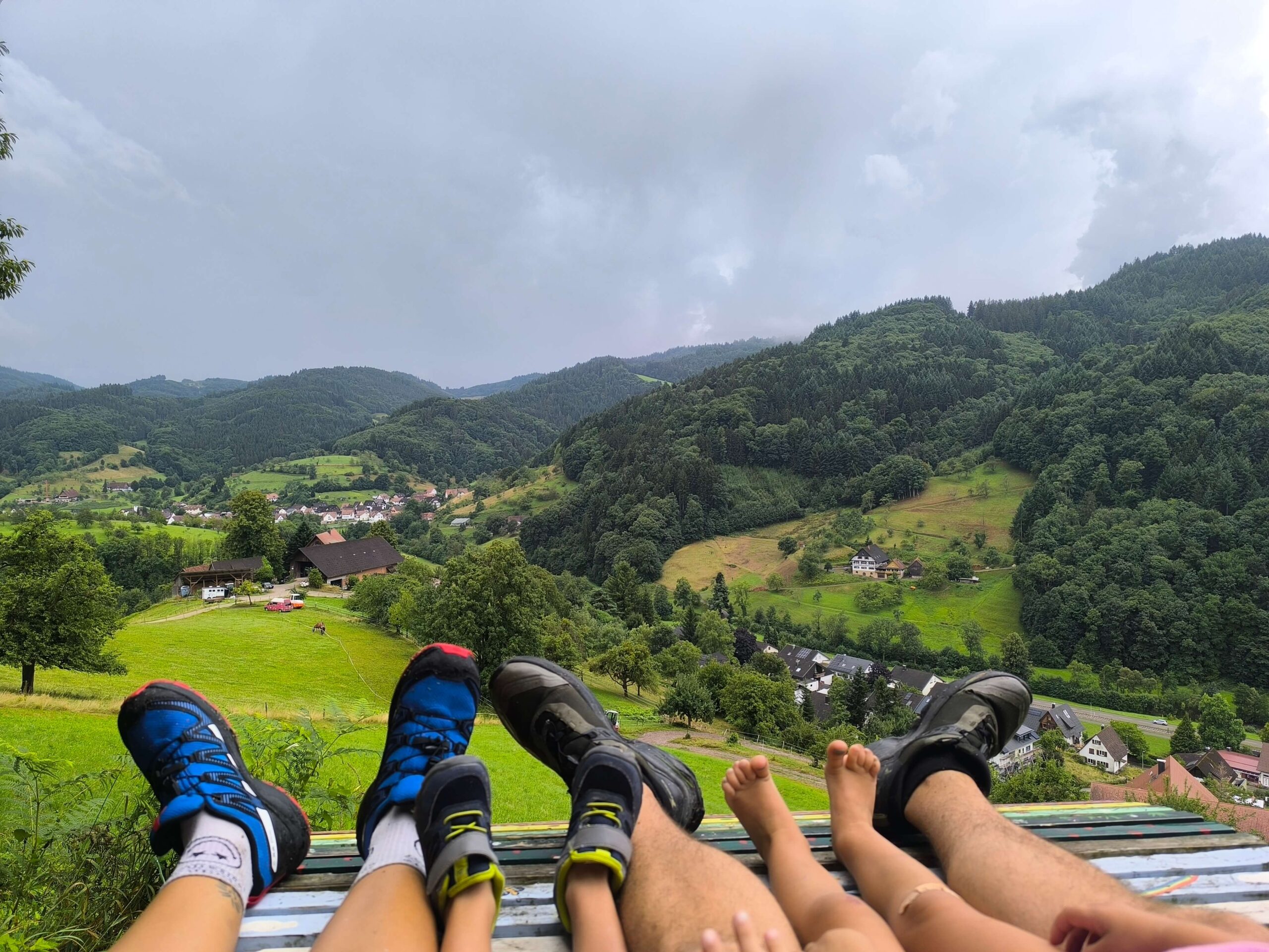 Otra parada que nos encantó fue el Park mit allen Sinnen en Gutach. Es un recorrido para ir descalzos por el bosque, caminando sobre barro, piedras o madera, con estaciones para adivinar animales tocando pieles o por sus sonidos, y plantas a través de sus olores. Acabamos llenos de barro y las niñas lo disfrutaron muchísimo 👣