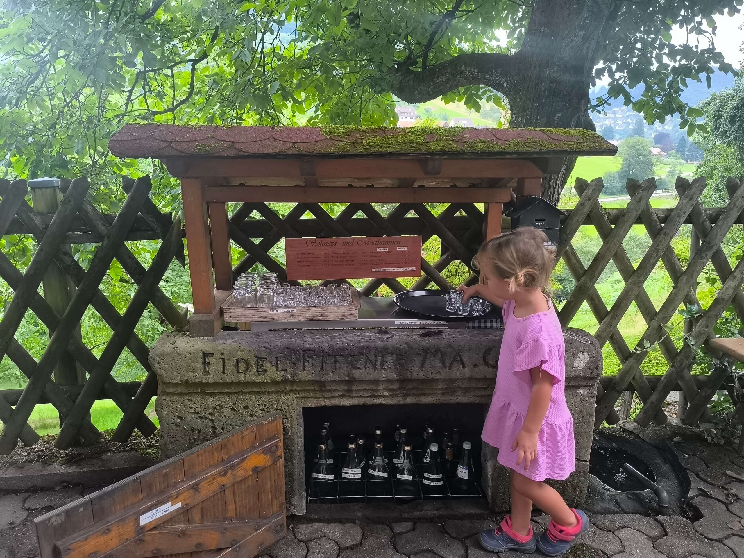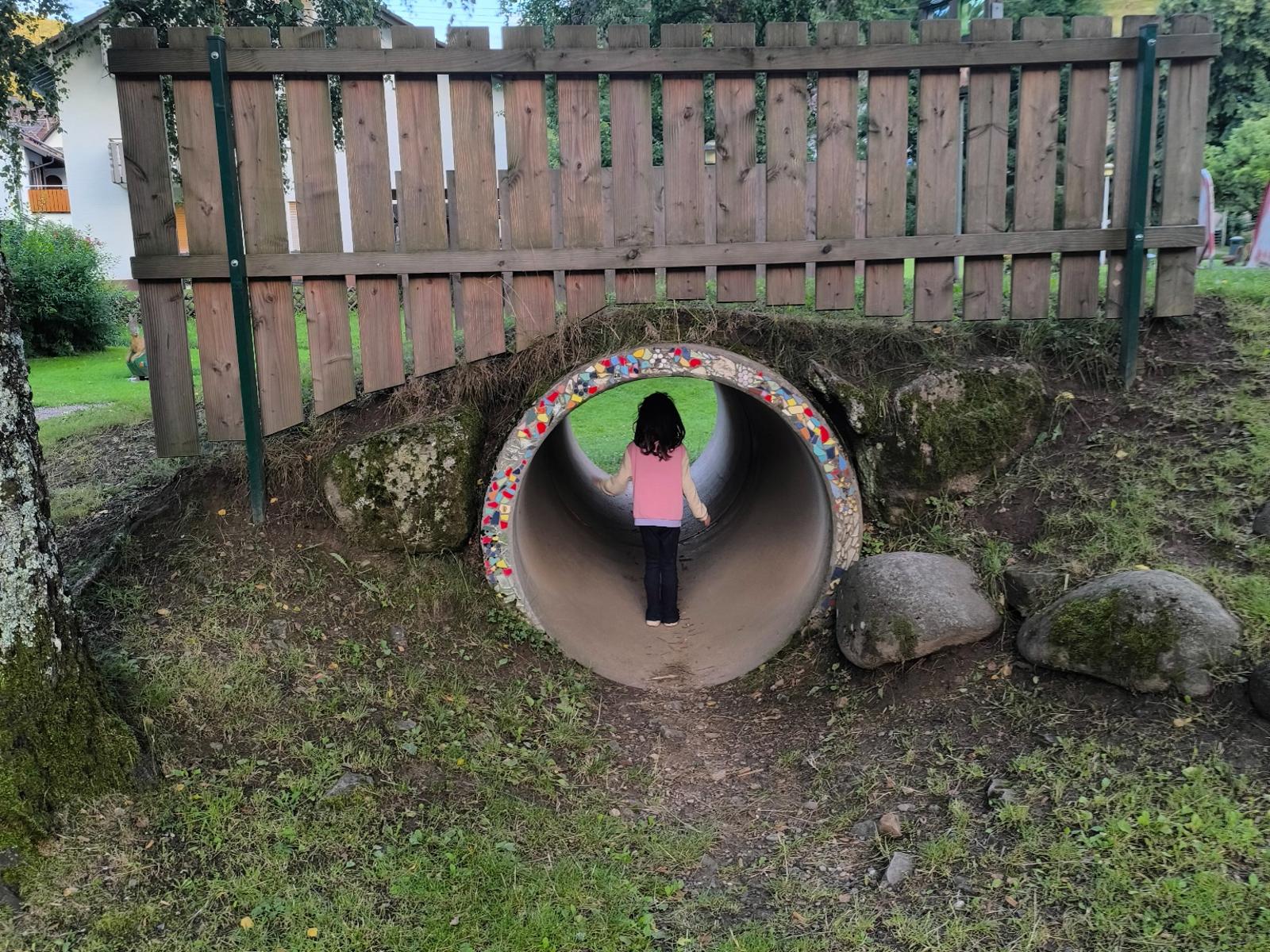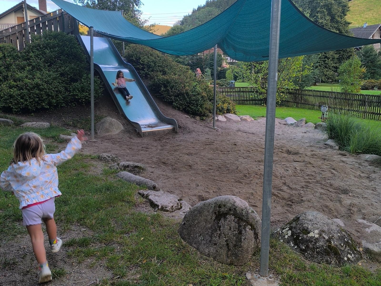 Otra parada que nos encantó fue el Park mit allen Sinnen en Gutach. Es un recorrido para ir descalzos por el bosque, caminando sobre barro, piedras o madera, con estaciones para adivinar animales tocando pieles o por sus sonidos, y plantas a través de sus olores. Acabamos llenos de barro y las niñas lo disfrutaron muchísimo 👣