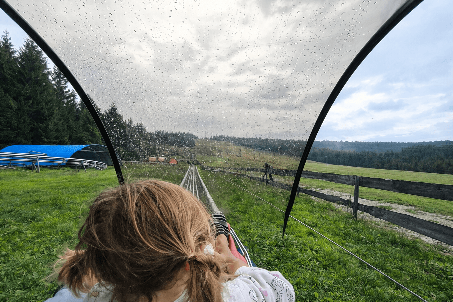 La siguiente parada fue la Rodelbahn del Mehliskopf, en plena Selva Negra, y la verdad es que nos lo pasamos como niños. Es un tobogán alpino sobre raíles: primero subes en el mismo carrito, que va enganchado a un sistema de remonte que te va llevando cuesta arriba por el bosque, y una vez arriba empiezas la bajada.
